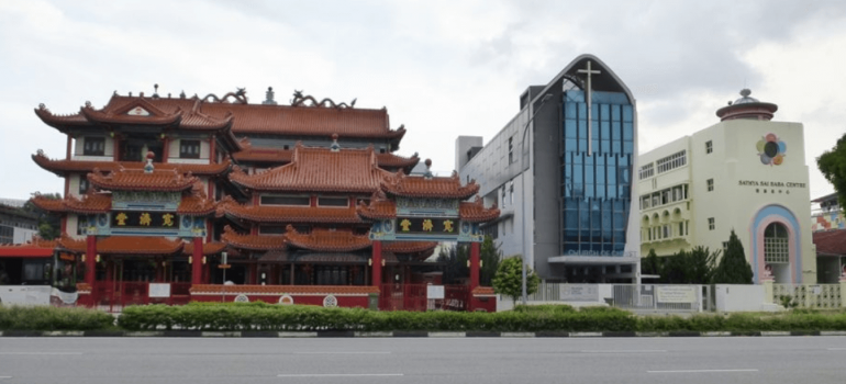 Buddhist temple, Christian church, Indian neo-Hindu centre along Moulmein Road, Singapore