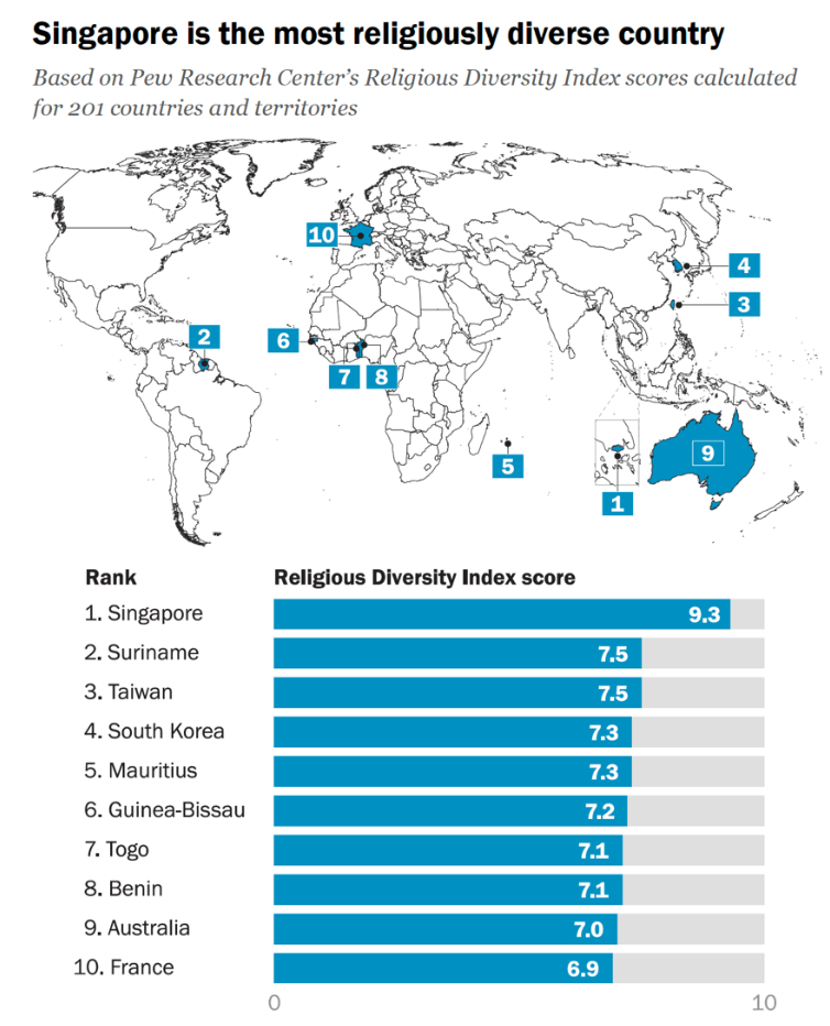 The latest Pew Research Center study ranks Singapore as the world’s most religiously diverse country as of 2020, using 7 religious categories to calculate a Religious Diversity Index (RDI) score. Higher scores on the RDI reflect a more even distribution of the 7 religious categories studied, namely Christians, Buddhists, Muslims, Hindus, Jews, religiously unaffiliated, and other religions.